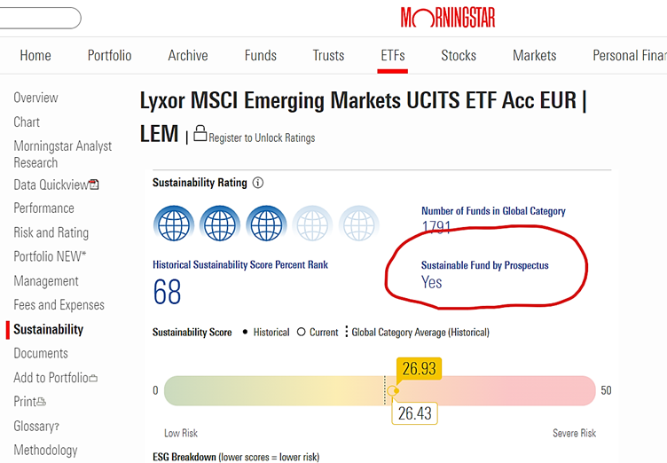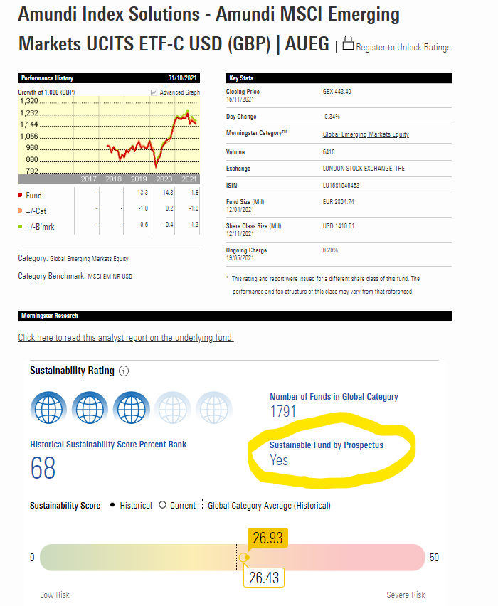 Another example is the £3.3 Bn Amundi MSCI Emerging Markets UCITS ETF, which is also a ‘sustainable investment’ according to Morningstar: