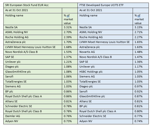 We compared the holdings of the Vanguard SRI European Stock Fund with Vanguards FTSE Developed Europe ETF based on the holdings on the 31st October 2021. The non-SRI fund holds 614 securities, of which we found only 25 were not in the SRI fund. The largest weightings of stocks within the Vanguard FTSE Developed Europe ETF, excluded within the Vanguard SRI European Stock Fund were Novartis (1.5%), HSBC (1.1%), BAT (0.7%), Airbus (0.6%), BHP (0.5%), Safran (0.4%), and Volkswagen (0.4%).