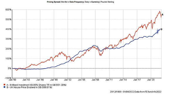 In our view, starting from where we are today, a mixed portfolio of shares and bonds should outperform the average UK house price.