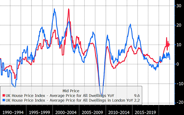 If we compare house price valuations to global share valuations the two seem poles apart. It has been recently reported [5] that U.K. House Prices rose 14.3% year on year, their largest rise since 2004 and 21% since the start of the pandemic spurred on by tax incentives, low borrowing costs and people seeking to move out of town during the pandemic. Other housing data, shows that the rises have been much greater outside London than in London: