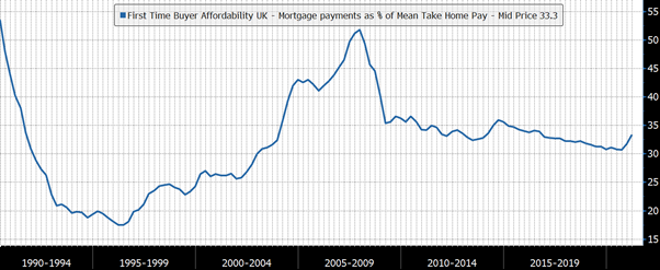 On this alone (and remembering that most people’s incomes are not rising as fast as inflation) buyers would experience mortgage payments as a percentage of mean take home pay rising from the current 33.3% to 37.5%, the highest since December 2008: