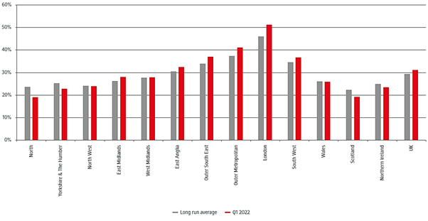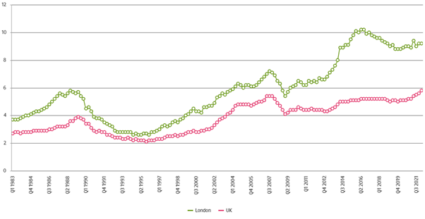 Whilst London house prices to income multiples have fallen back since their 2016 peak, they remain elevated by historical standards:
