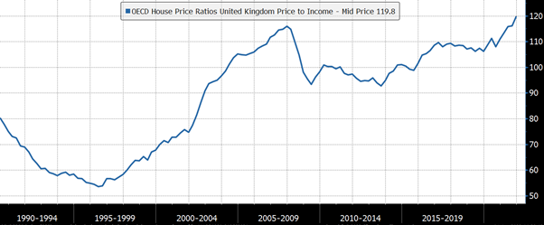 Meanwhile the ratio of UK house prices to income is now at its peak since 1990:
