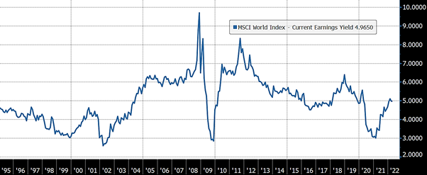 The valuation of world equities (which already incorporates the much higher valuation of US stocks), in terms of their earnings yield (the earnings per share divided by the stock price), shows stocks to be fairly valued: