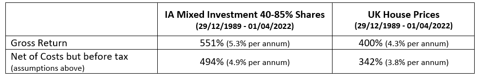 We found that the typical balanced fund of shares and bonds, after costs, produced a higher return than housing – 551% return vs a 400% return. Returns that do not include the costs of buying and selling houses, estimated at 2.3% (excluding deposit) of the average purchase price [1] and c. 2.1% of the average selling price [2].
