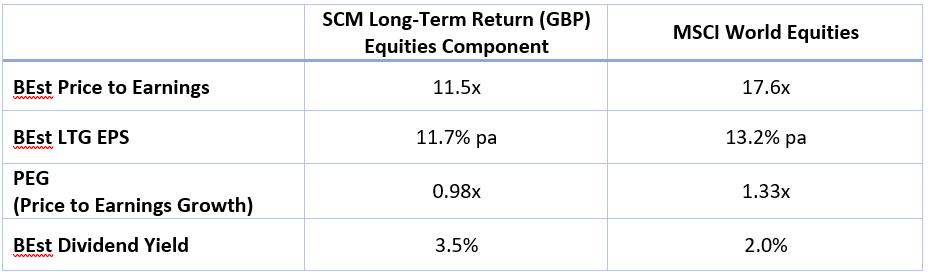 However, investors do not have to buy an index of world equities (dominated by expensive US tech stocks) or UK government bonds. There are plenty of different choices of mixed equity/bond funds/portfolios. For example, our SCM Long-Term Return Portfolio has its US equities exposure via a value-based strategy, a tilt towards small/mid-caps in Europe/Japan/emerging markets, resulting in a well-diversified portfolio of shares with slightly lower growth but with a significantly lower valuation. Growth is effectively being purchased on a 26% discount to a traditional market cap weighted index (based on the PEG ratio):