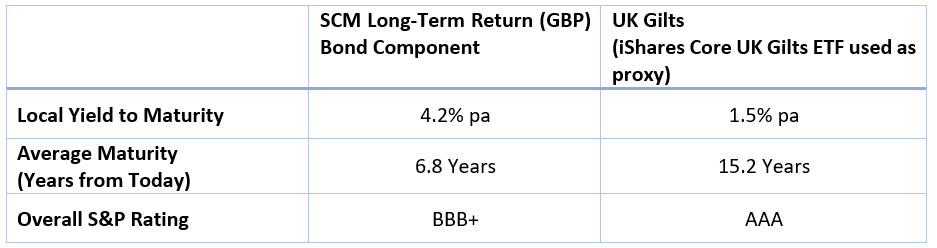 Similarly, investors do not have to buy UK government bonds. Within the SCM Long-Term Return Portfolio contains a combination of corporate bonds and non-western government bonds with the following characteristics: