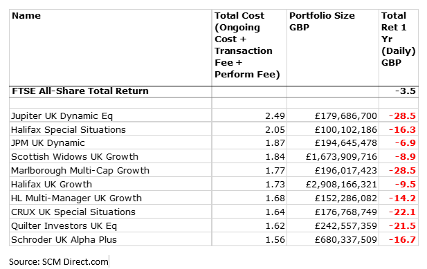 Of the 10 most expensive funds analysed, all 10 had actually underperformed the FTSE All-Share Index over the last 12 months.